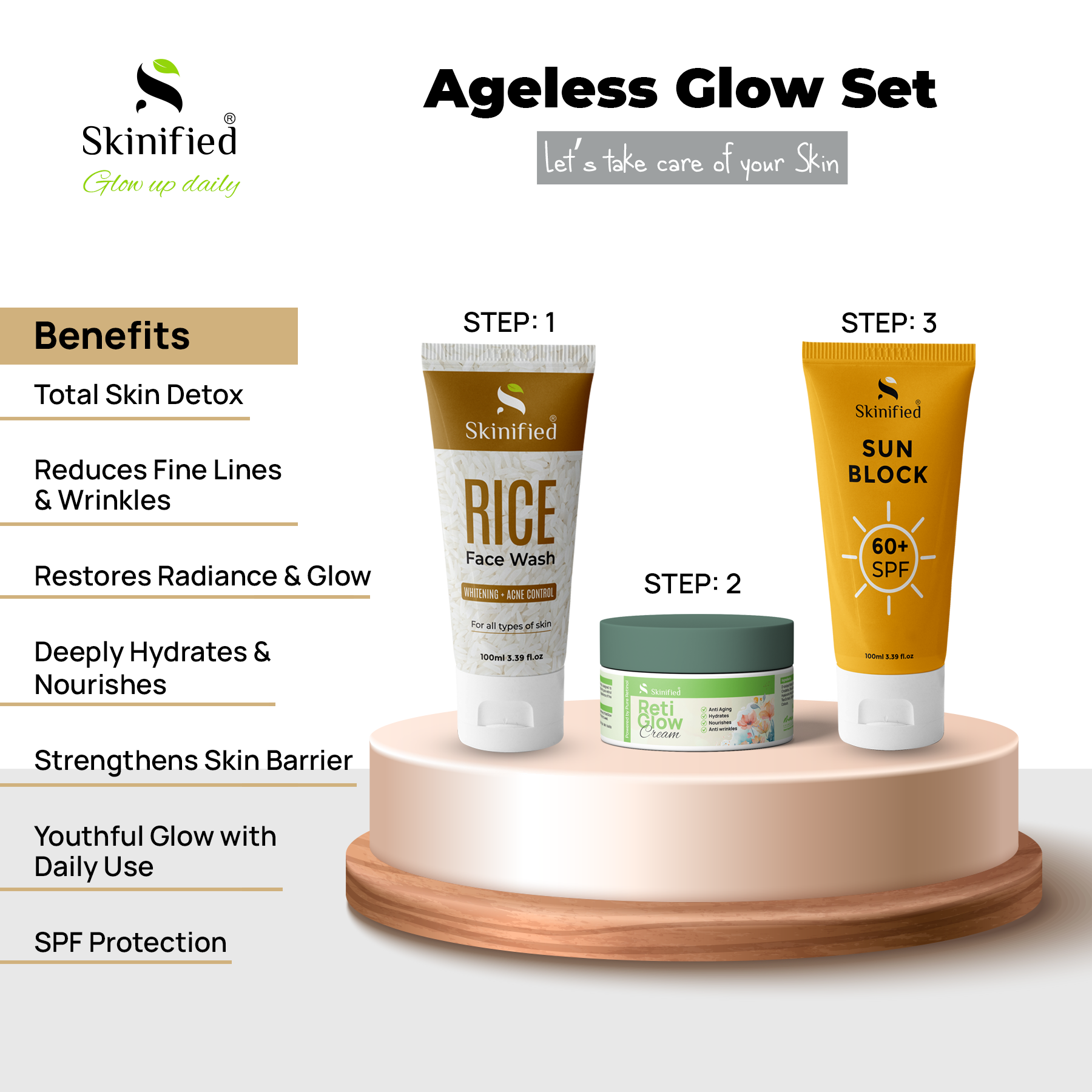 Unlock the secret to youthful, radiant skin with Skinified’s Ageless Glow Set — a professionally curated skincare regimen designed to target visible signs of aging while deeply hydrating and nourishing the skin. Each product in this set works in synergy to help reduce fine lines, improve skin texture, and restore a natural, healthy glow.