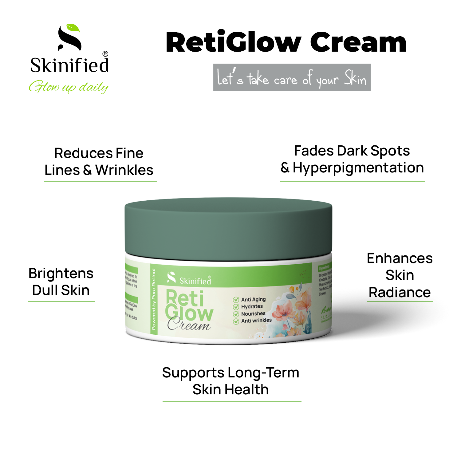 Skinified RetiGlow Cream is a scientifically formulated skincare solution designed to target early signs of aging, uneven skin tone, and texture irregularities. Powered by encapsulated retinol, vitamin E, and soothing botanical extracts, this advanced formula works overnight to boost skin renewal, smooth fine lines, and restore a radiant, youthful glow.