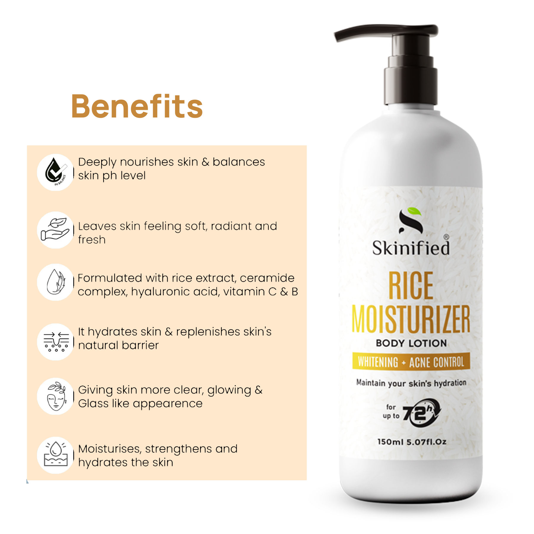 Skinified rice moisturizer enriched with rice-derived ingredients like rice water, rice bran oil, or fermented rice extract. Known for its hydrating, brightening, and skin-soothing properties, a rice moisturizer works to nourish and replenish the skin, making it feel soft, smooth, and hydrated. It is often included in routines aimed at promoting healthy, glowing skin while addressing concerns like dryness, dullness, or uneven skin tone.