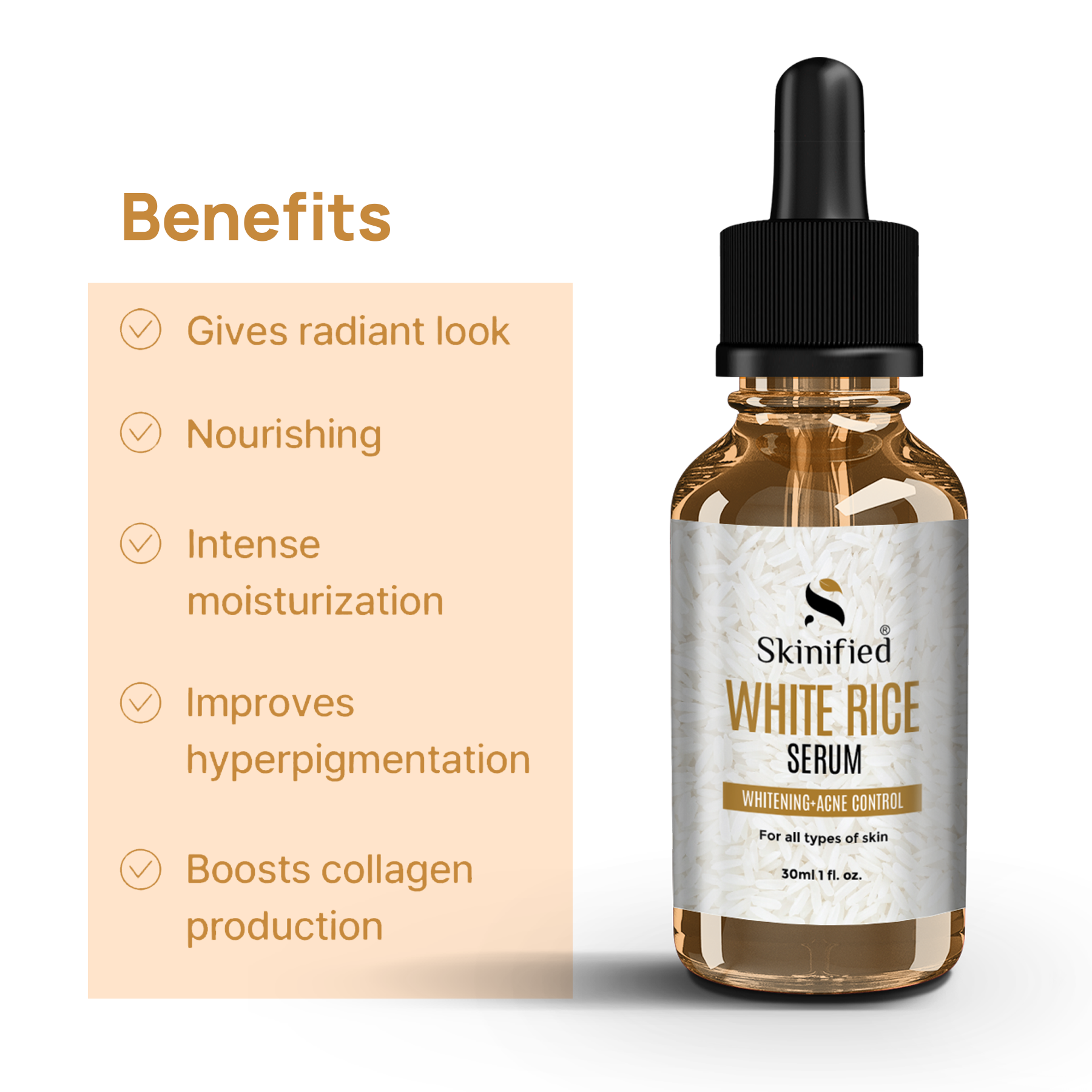 Skinified rice serum formulated with rice-based ingredients, often rice water, rice bran oil, or fermented rice extract, which are known for their beneficial effects on the skin. Rice ingredients have been celebrated for their brightening, hydrating, and anti-aging properties. A rice face serum typically targets specific skin concerns like dullness, uneven skin tone, dryness, and signs of aging, delivering active ingredients deep into the skin for maximum efficacy.