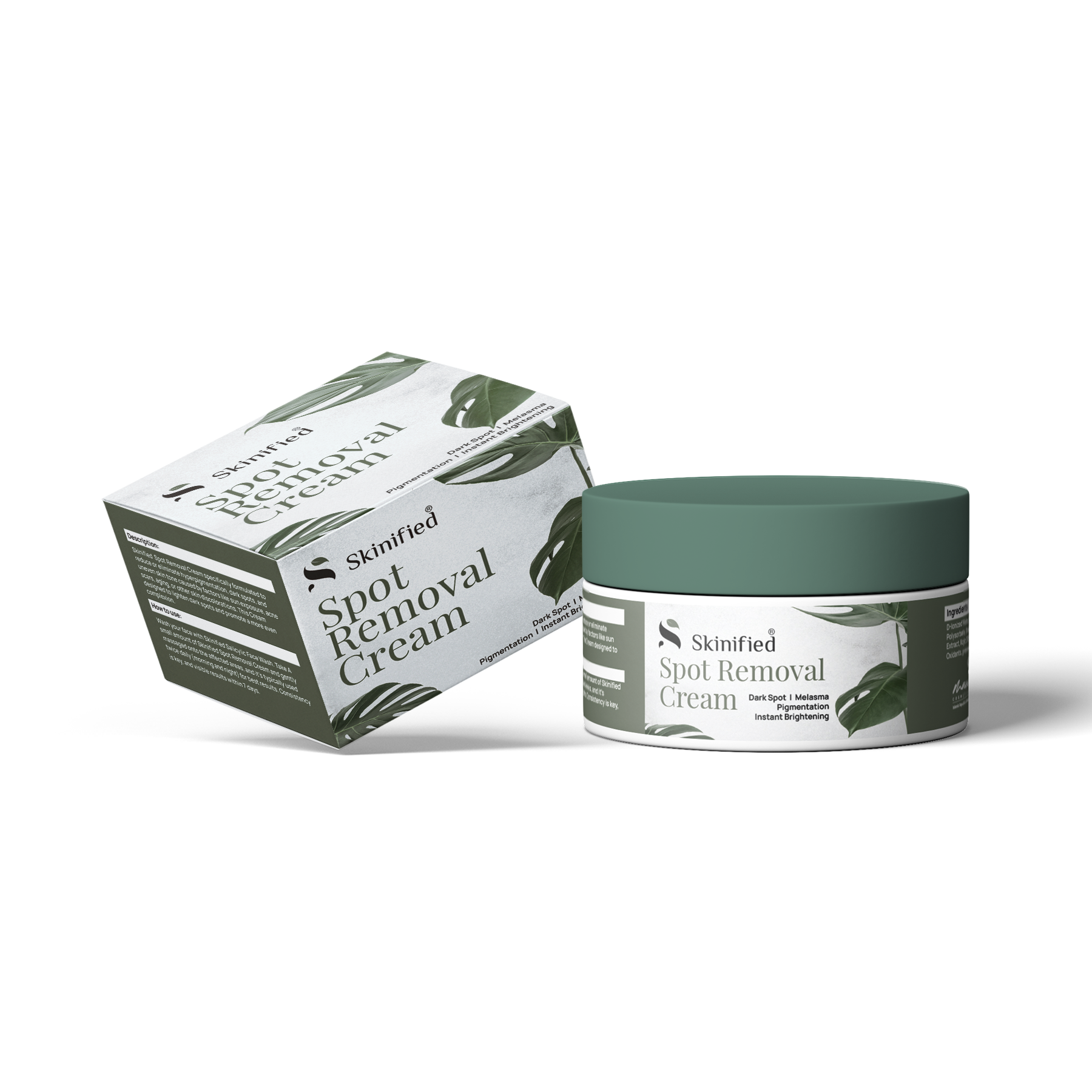 Skinified Spot Removal Cream is specially formulated to target pigmentation, acne marks, sun spots, and blemishes. Infused with powerful yet gentle ingredients like niacinamide, licorice extract, and vitamin C, this cream helps visibly fade discoloration, even out skin tone, and restore your natural glow.