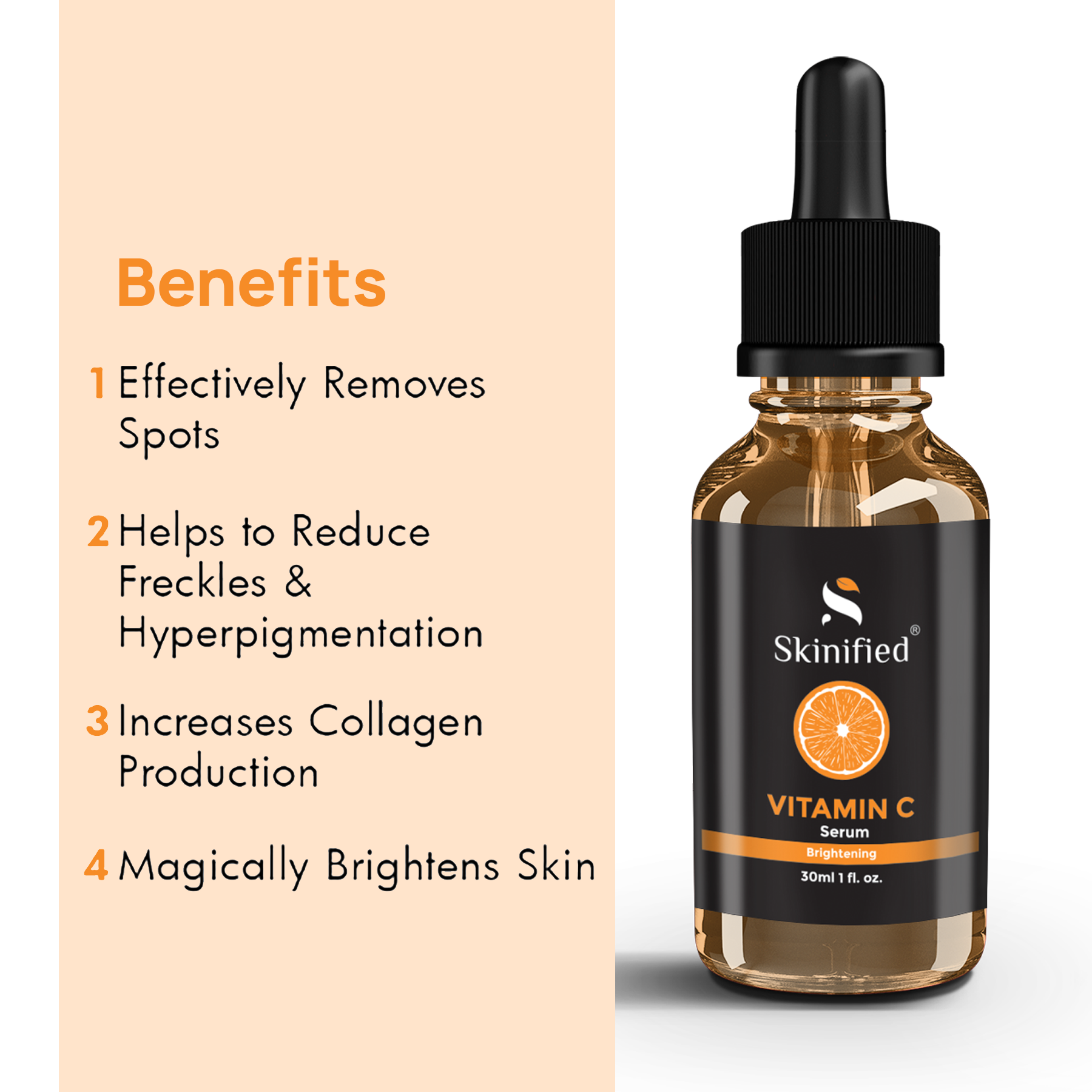 Illuminate your complexion with Skinified Vitamin C Serum, expertly formulated to target dullness, uneven skin tone, and early signs of aging. Powered by a stable and high-performance form of Vitamin C, this lightweight serum works to brighten the skin, fade dark spots, and support collagen production for a smoother, firmer, and more radiant appearance.